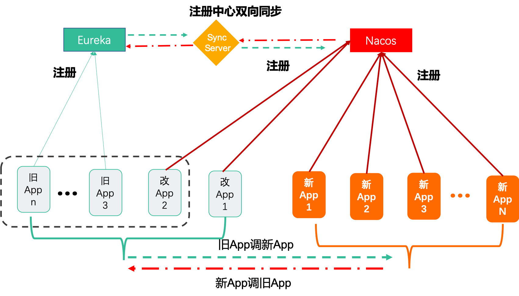 如上图所示,如果只把旧应用只改一部分,会出现只有改造的应用能调到新应用。未改造的应用会出现调不到新应用的情况。即,需要如下图所示的方式,旧应用全部升级改造为双注册到注册中心,才可以支持。