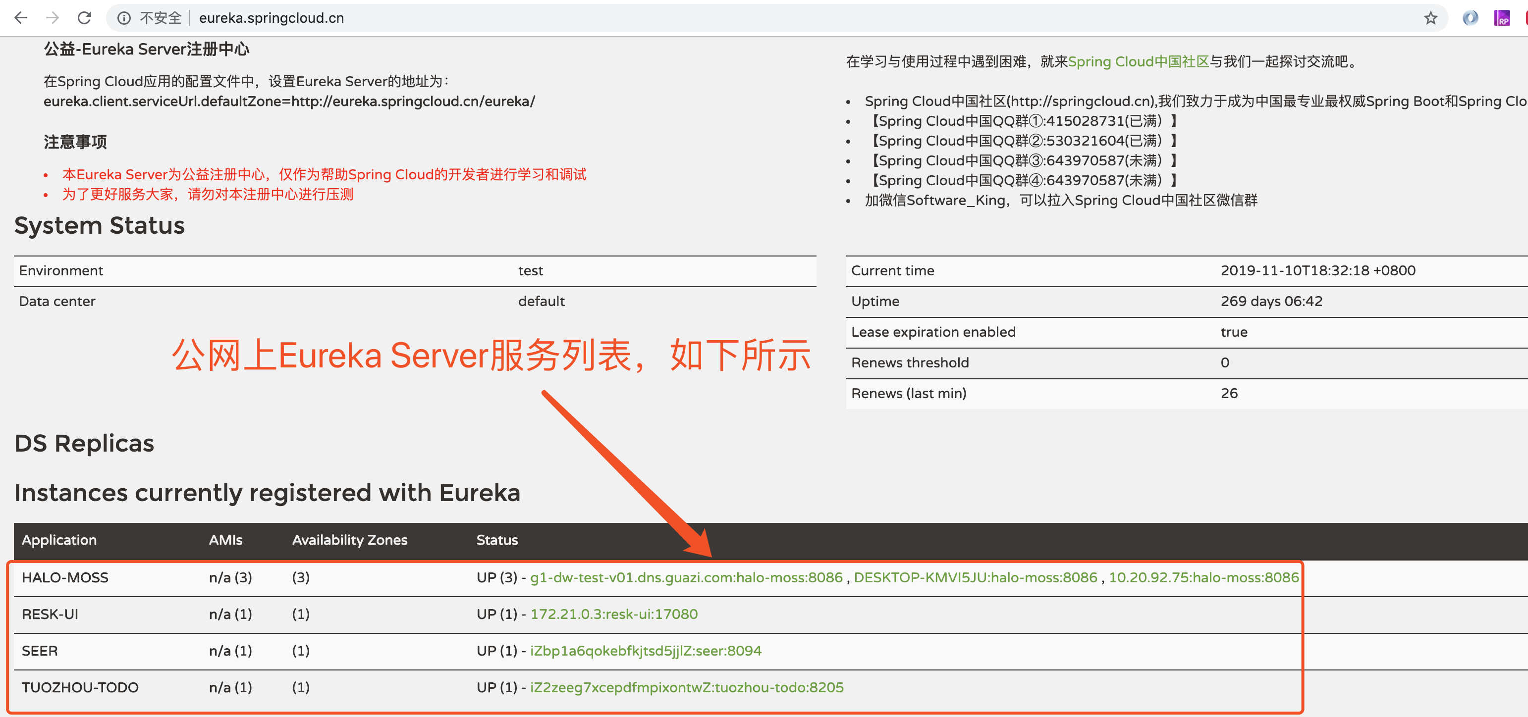 Spring Cloud中国社区公网上有个Eureka注册中心,地址为:http://eureka.springcloud.cn/