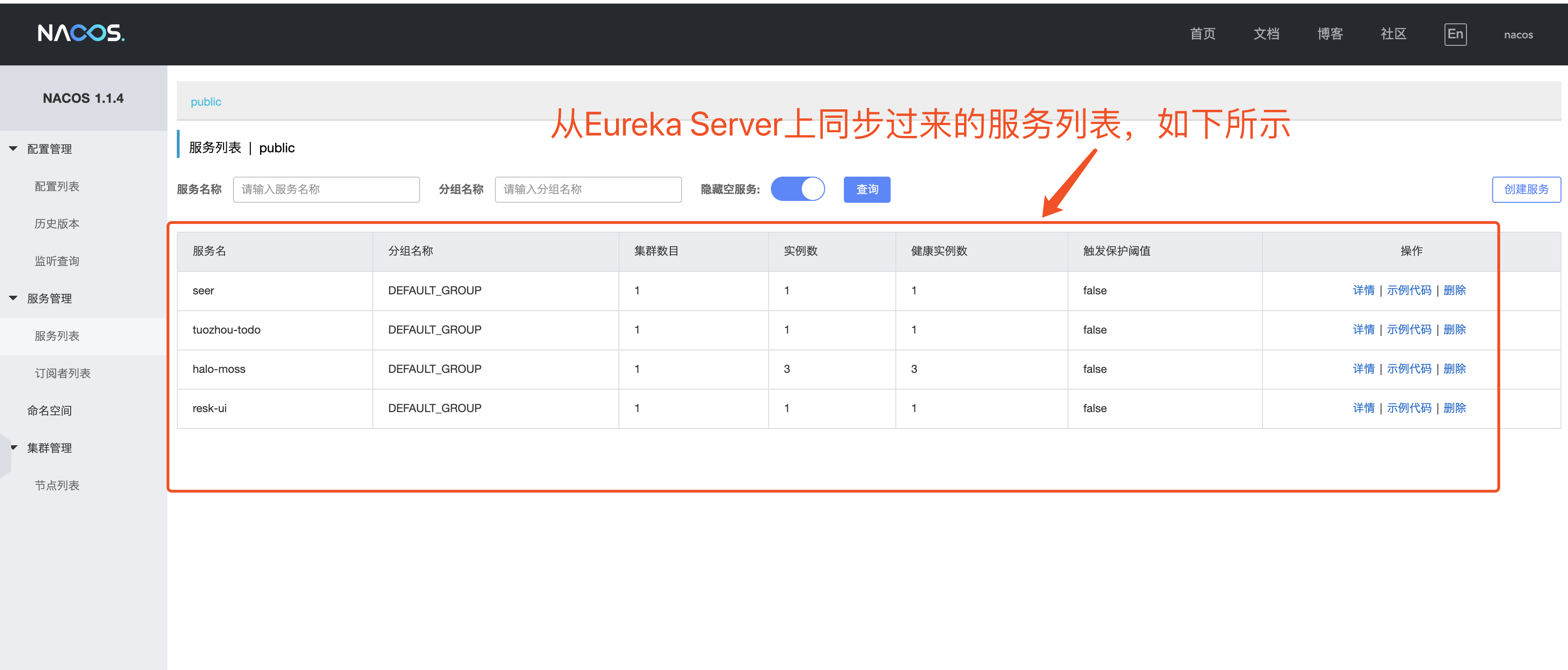 启动同步服务,访问Nacos页面发现已经把Eureka上面的服务同步到Nacos,如下所示: