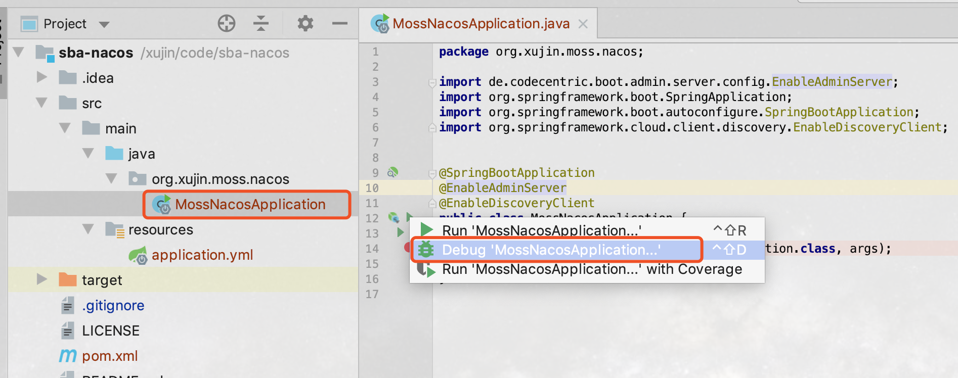 以Debug方式启动,sba-nacos,如下图所示: