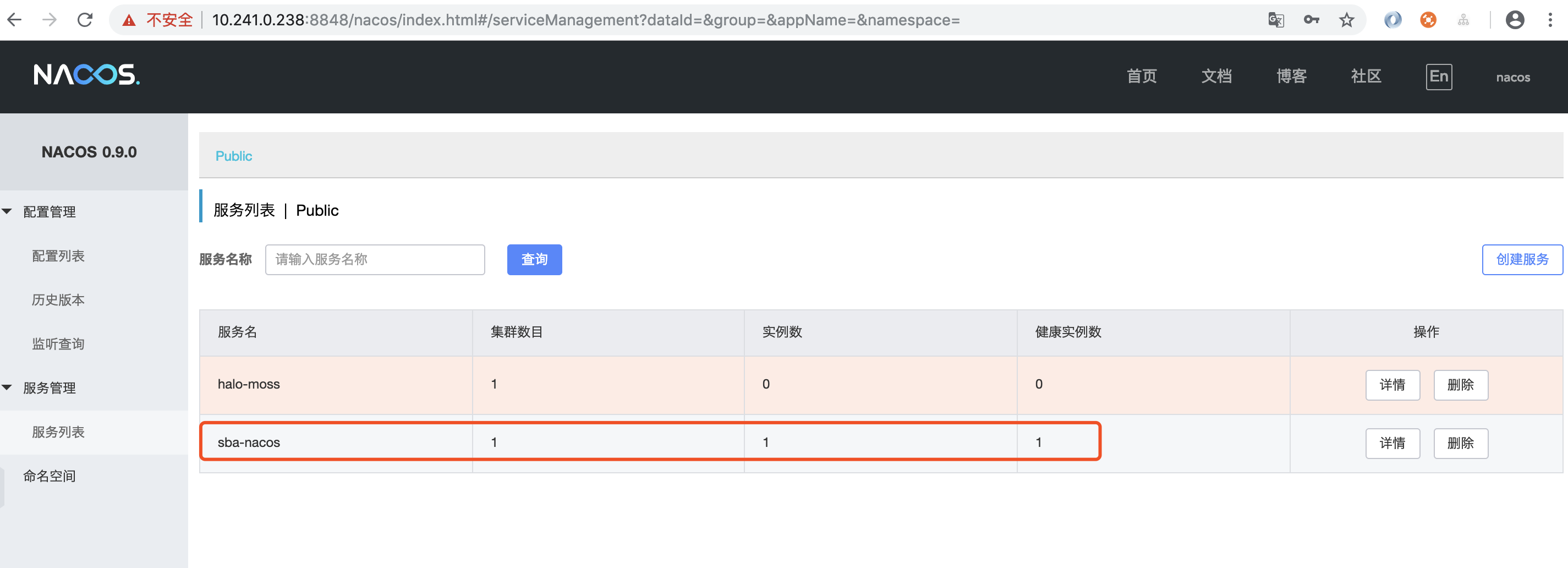 启动之后访问nacos控制台,我们可以看到sba-nacos已经注册到Nacos注册中心。如下图所示.