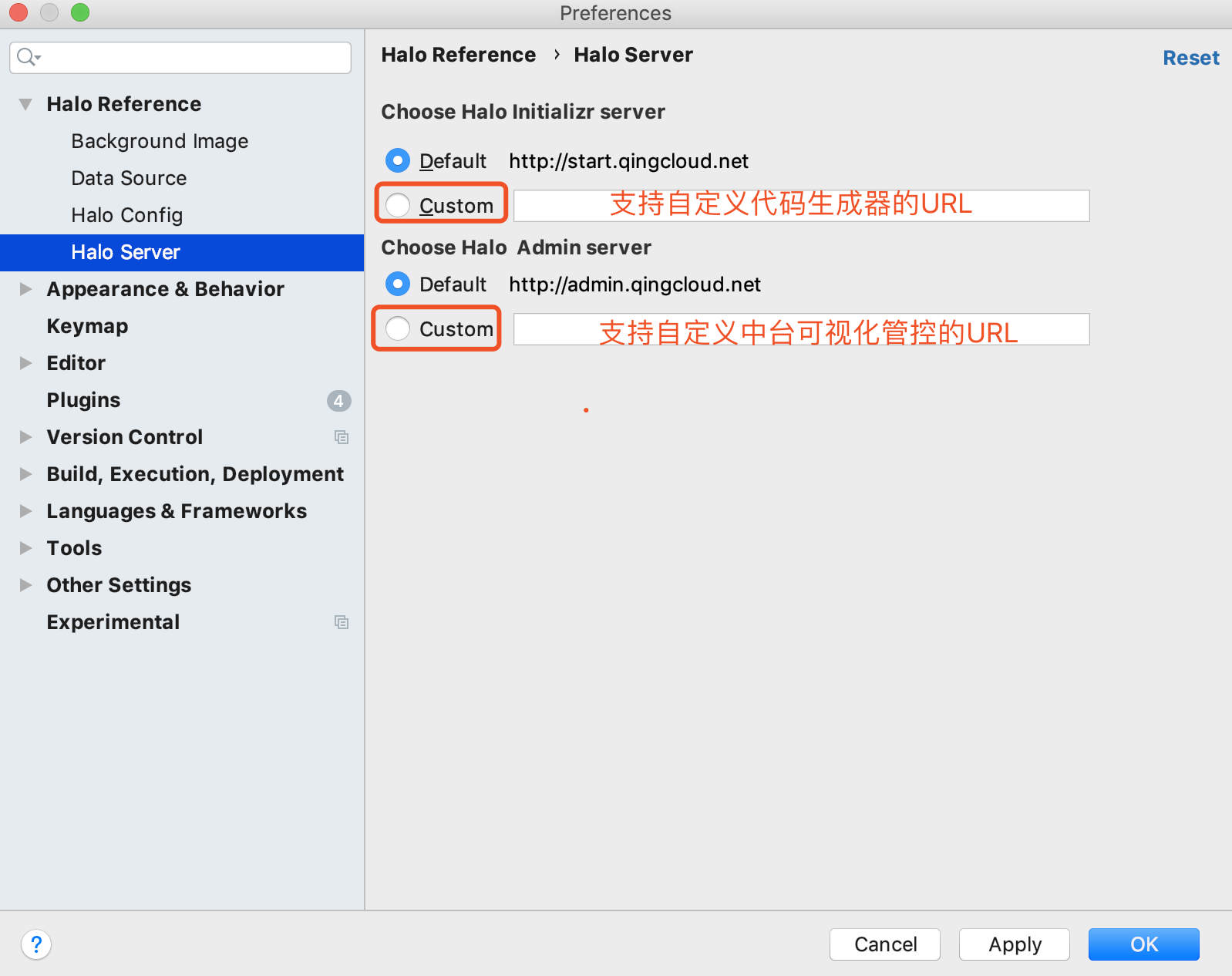 Halo ToolKit支持自定义Halo框架对应的代码生成器服务端和Halo Admin可视化中台管控服务端,如下图所示: