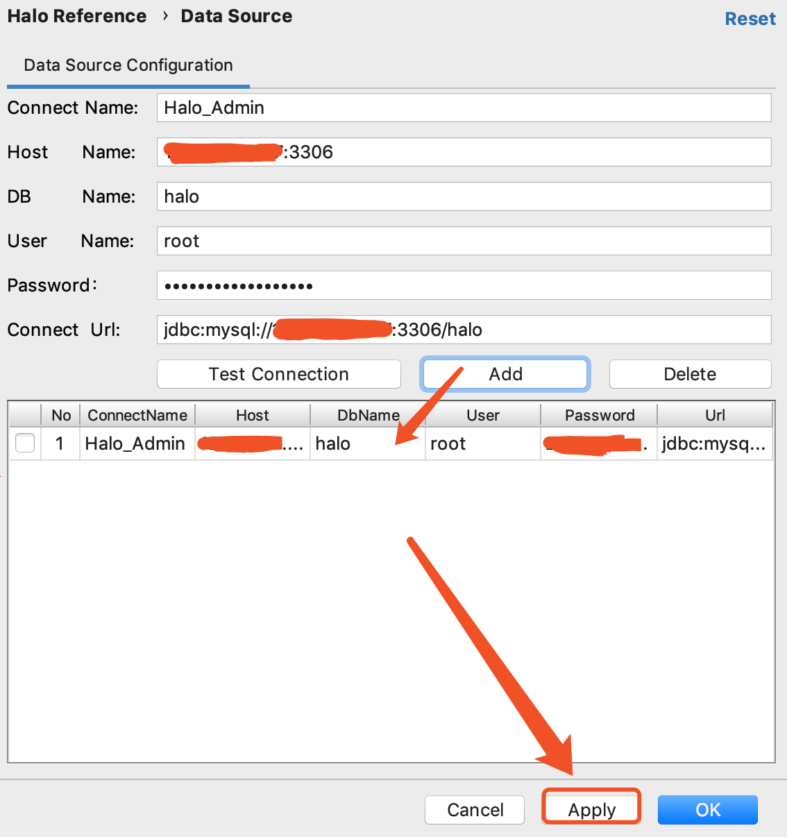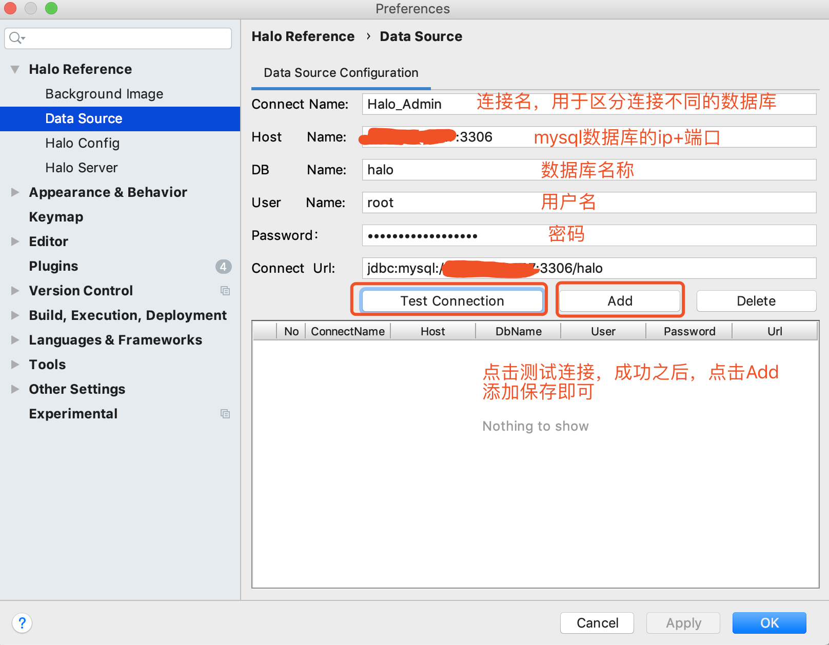 Halo ToolKit支持对Mysql数据库数据源的的增加,删除,测试连接的管理存储,方便在IDEA插件需要使用的地方直接选择即可,如下图所示: