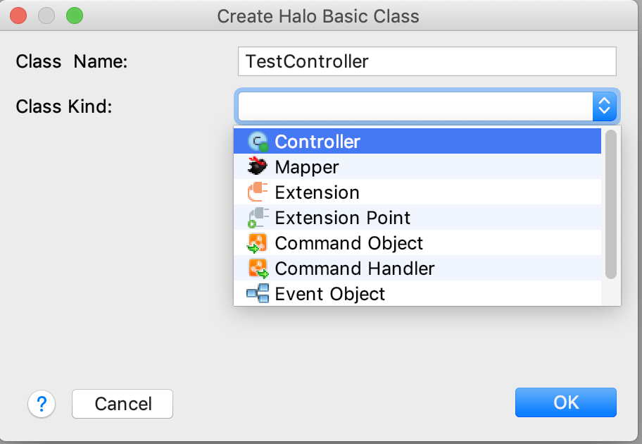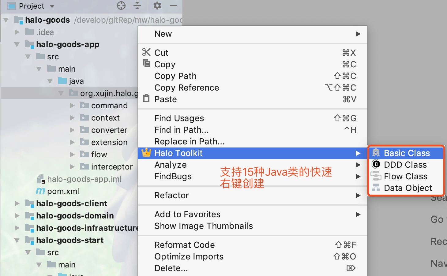 Halo ToolKit增强右键 Halo ToolKit提供右键增强功能,帮助开发快速创建常用的Java类,提高开发效率。如下图所示: 如下图所示,右键支持创建13种Java类,包括创建实体,域服务,流程,资源库,Controller等